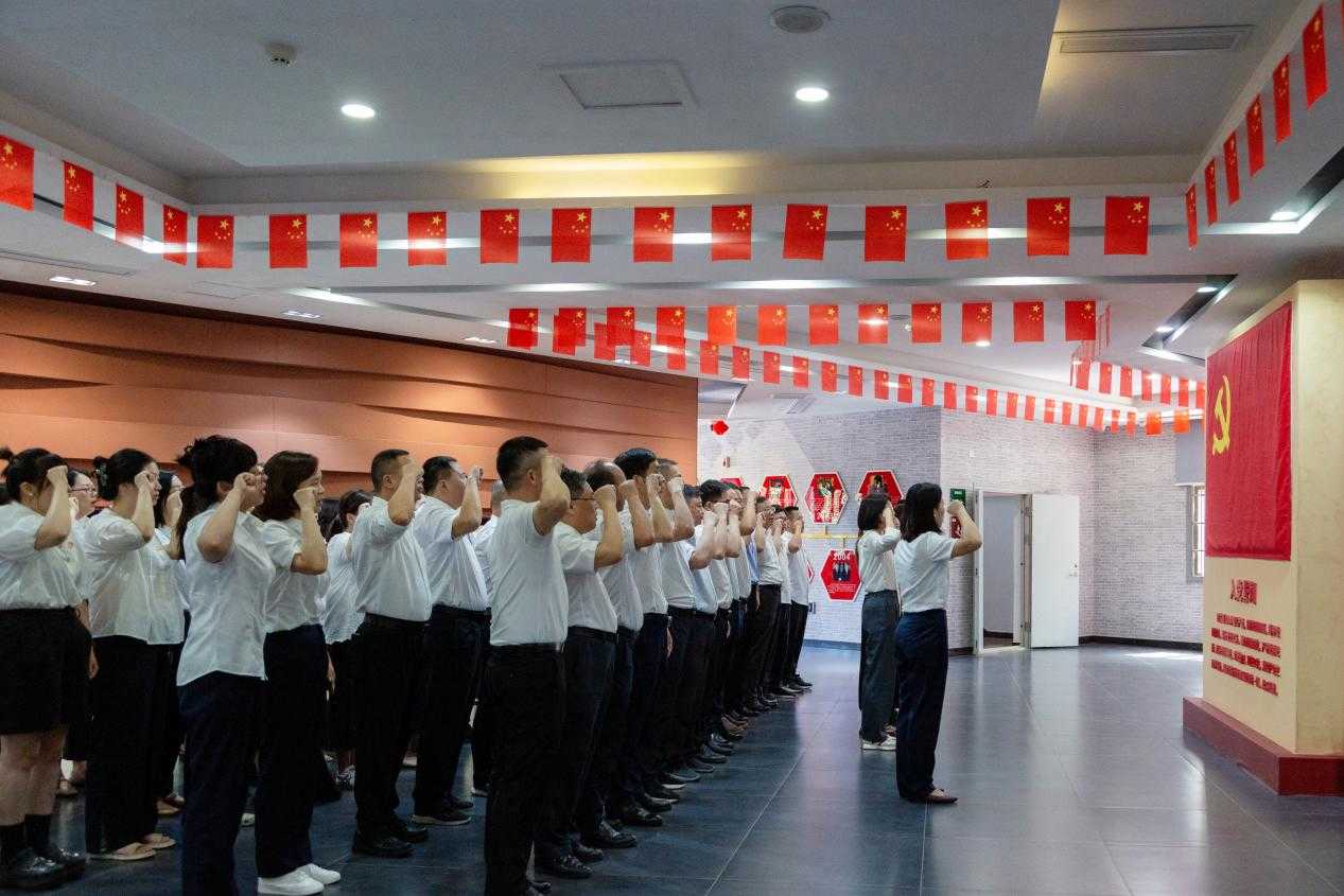 在新四军第五师历史陈列馆,面向鲜红的党旗,在领誓人的带领下,新党员进行了庄严的入党宣誓,全体党员重温入党誓词。一字一句,激励着每一位党员不忘初心、砥砺前行,将大别山精神深深刻入骨髓,化作推动盐业事业蓬勃发展的不竭动力。