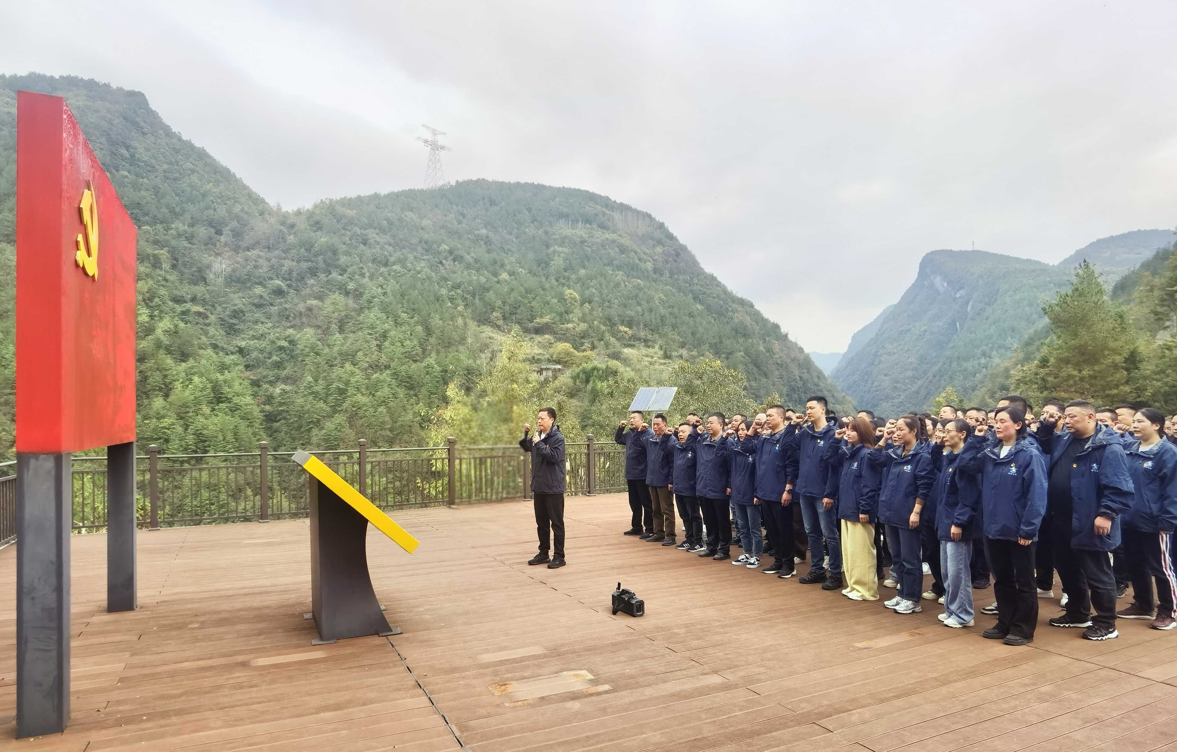 在店子坪红色教育基地,全体人员踏上入党宣誓平台,在庄严的党旗下,党员们齐戴党徽,举起右手,庄严地重温了入党誓词。铿锵有力的誓言回荡在现场每一个人的心中,激发了大家不忘初心、牢记使命的决心和信心。