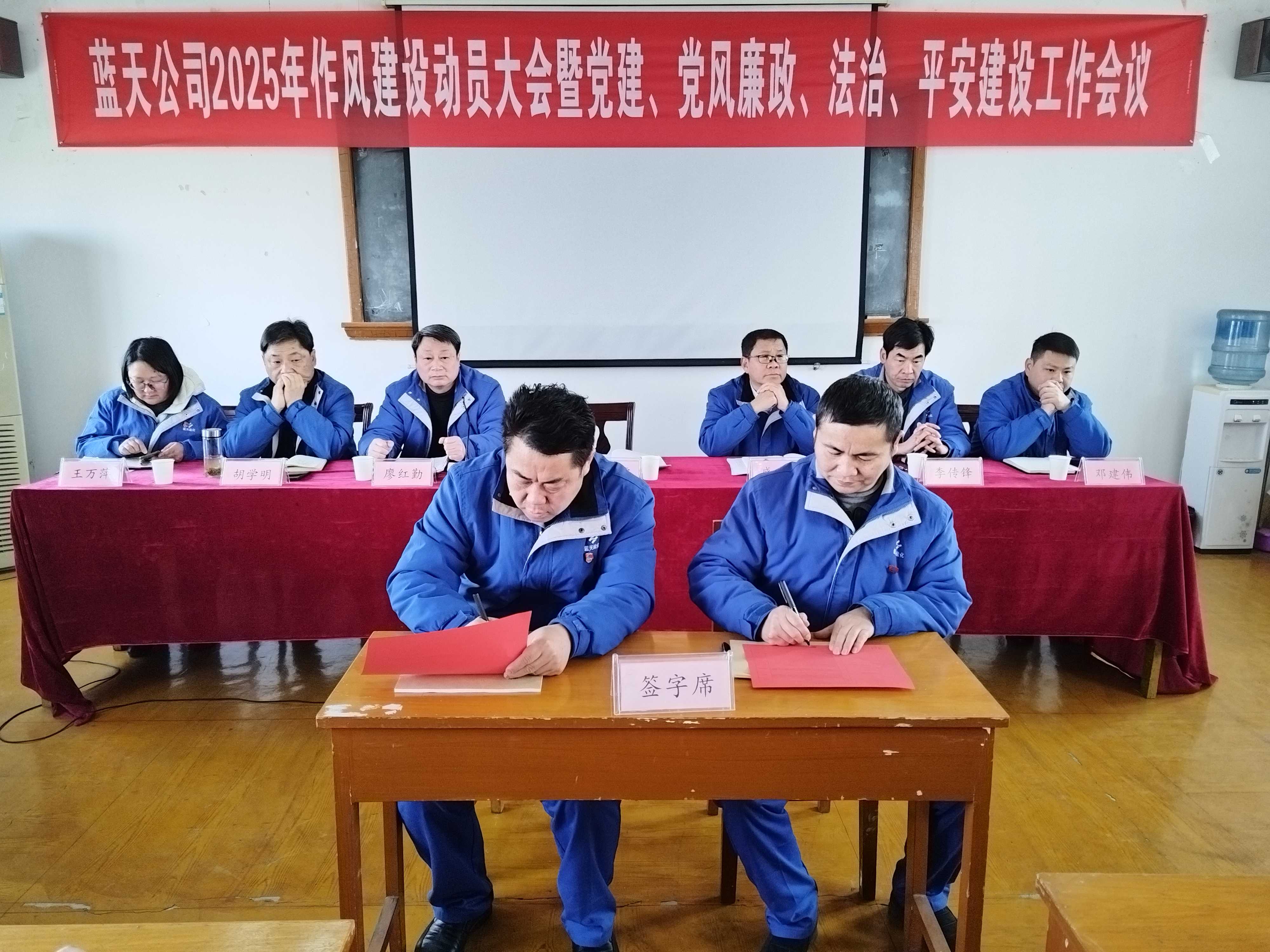 会上,公司党委副书记、纪委书记盛建平作了题为“党建引领、担当作为 --为蓝天公司高质量发展聚力赋能”的党建和党风廉政工作报告。公司党委书记、董事长夏军虎与各部门负责人签订了《2025年经营目标考核责任书》;与各支部书记签订了《2025年党建和党风廉政建设责任书》;与安全环保部等部门签订了《平安建设目标管理责任书》。