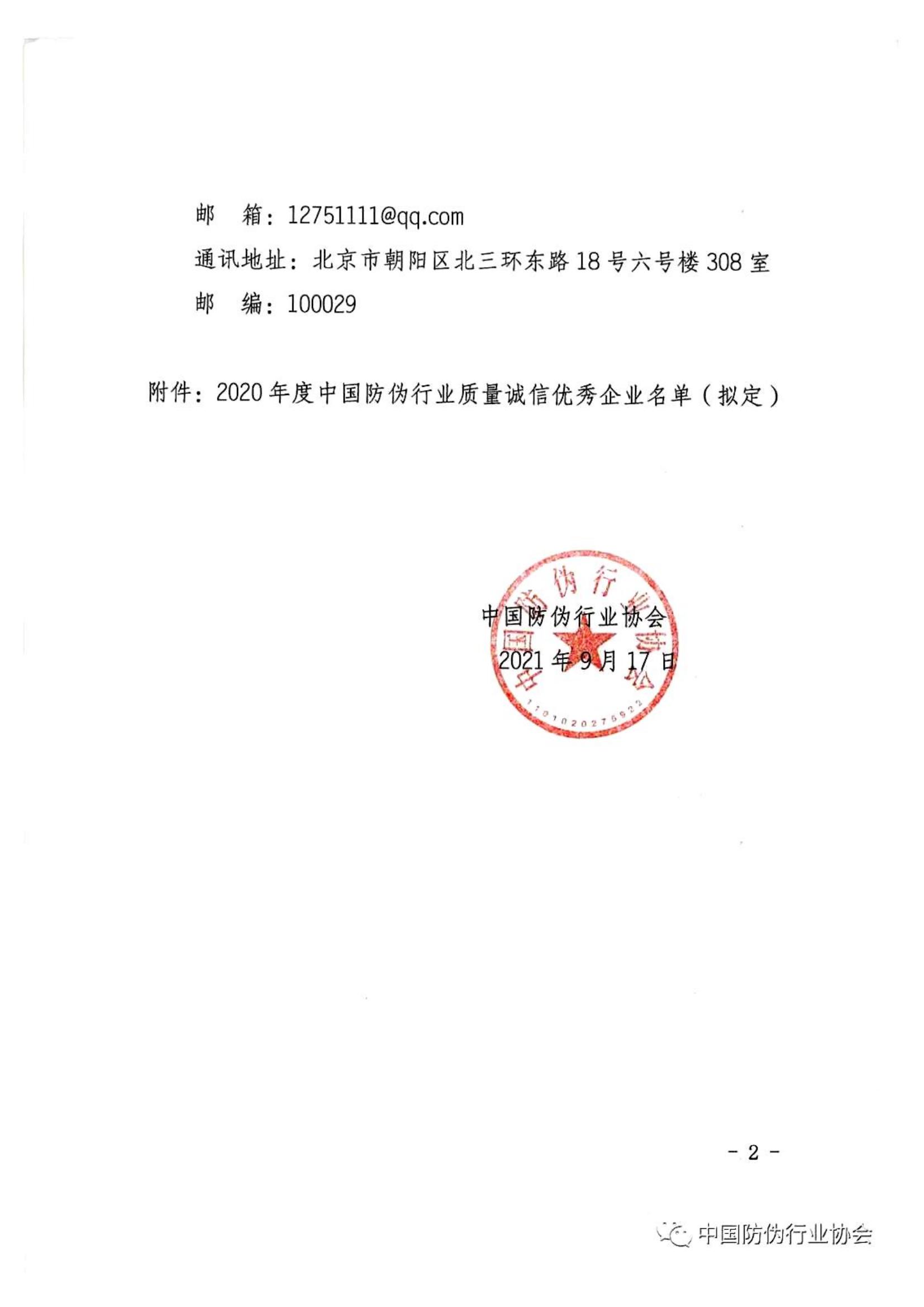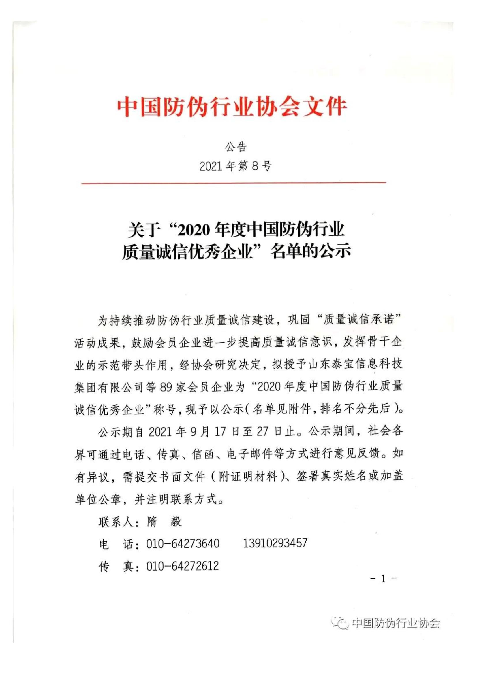 关于“2020年度中国防伪行业质量诚信优秀企业”名单的公示