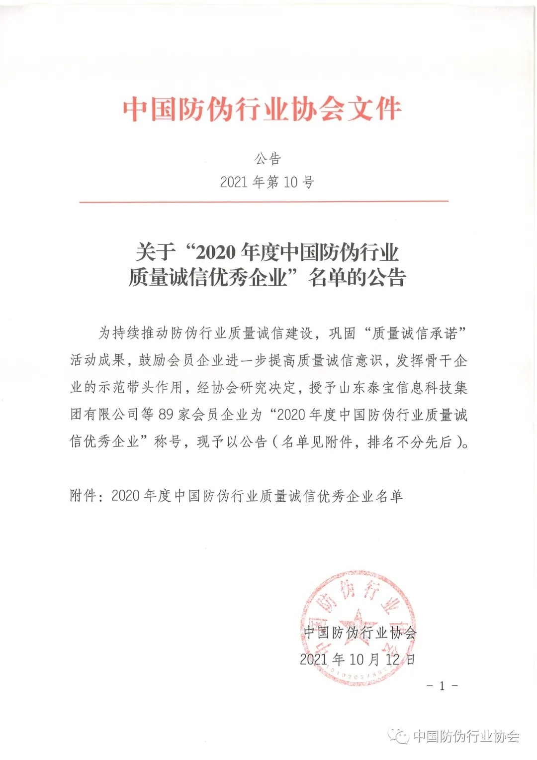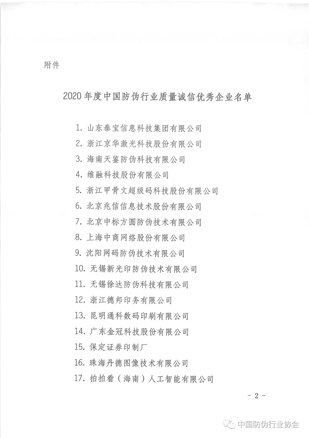 关于“2020年度中国防伪行业质量诚信优秀企业”名单的公告