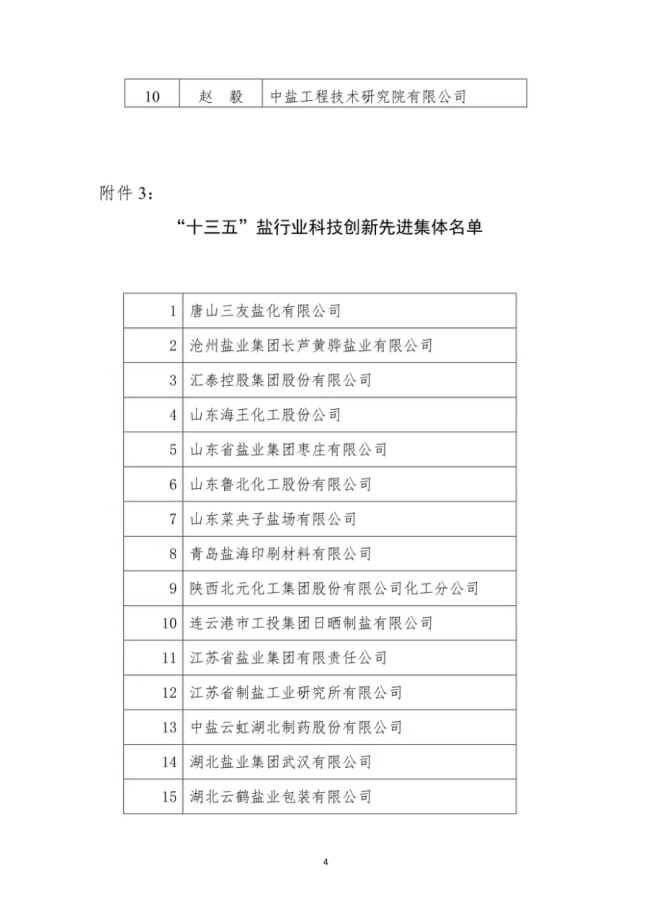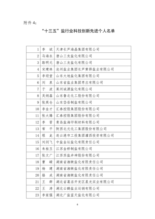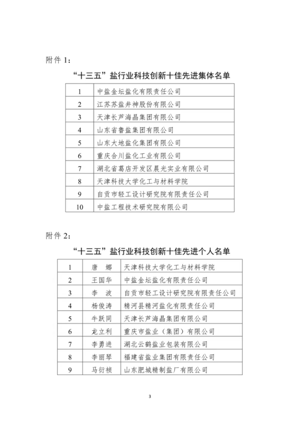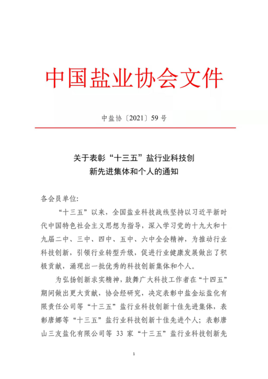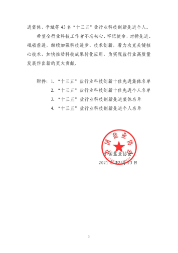 关于表彰“十三五”盐行业科技创新先进集体和个人的通知